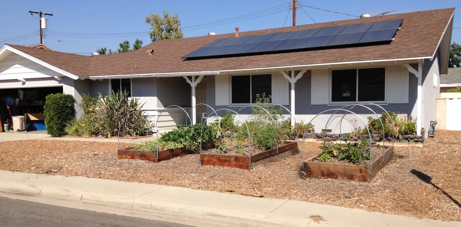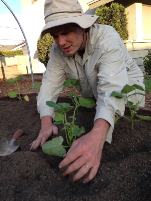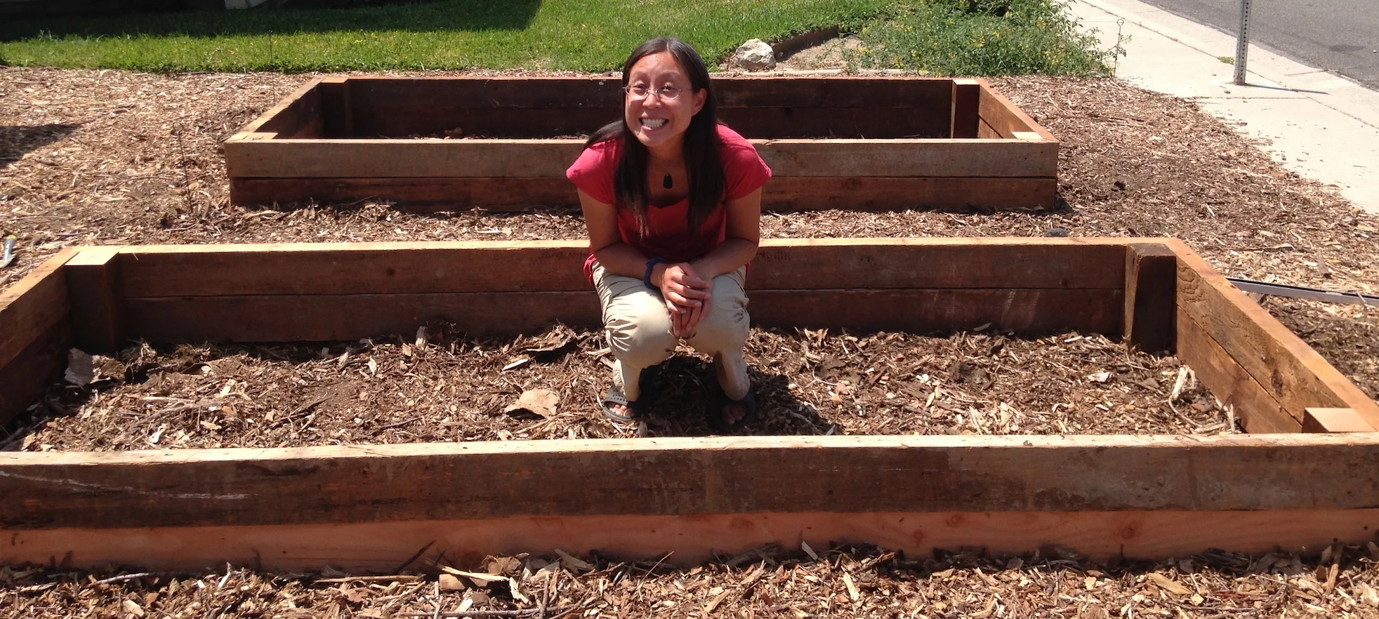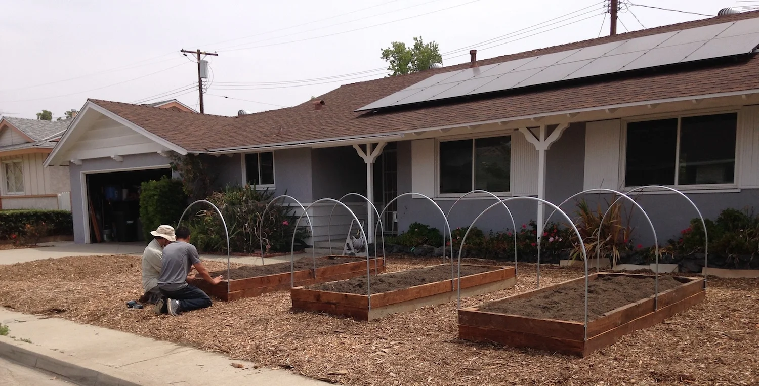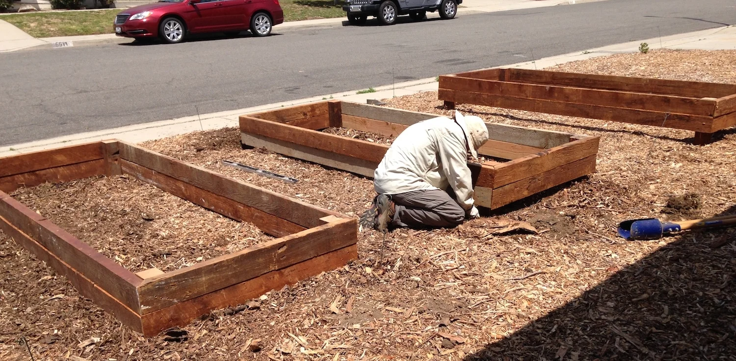 Chris got to work building raised beds. He found a place in Los Angeles that sells salvaged wood and loaded up his bike trailer with long boards of Douglas fir. Then he skillfully cut them...