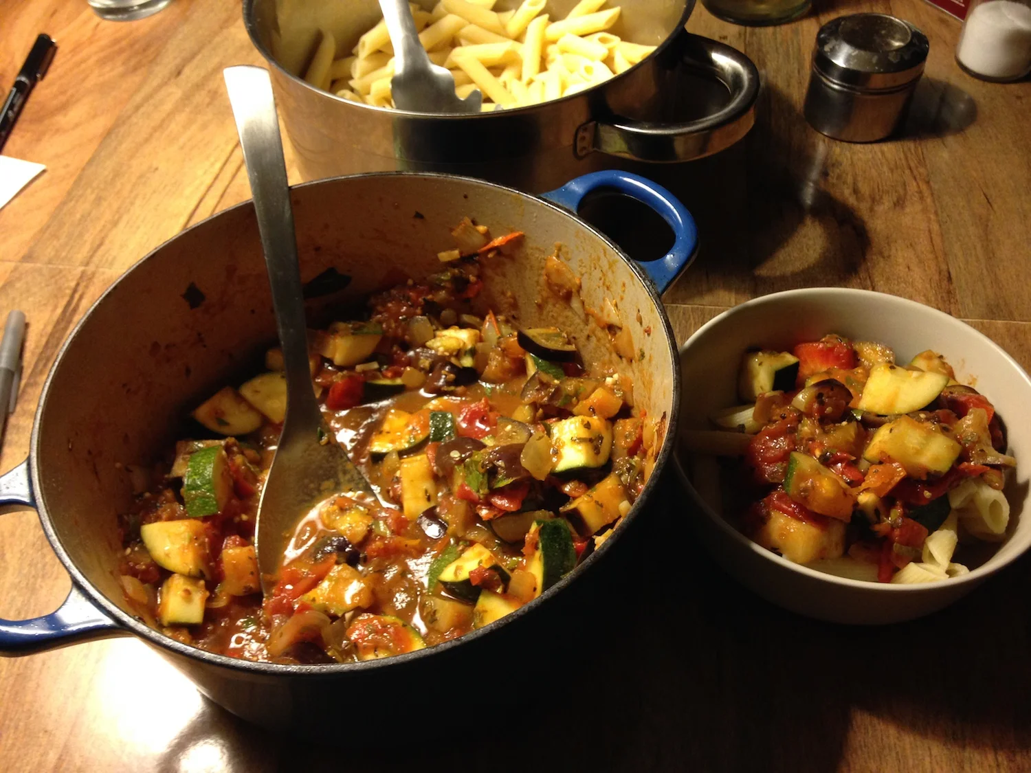 Dinnerrrrr! Chris made a delicious ratatouille-inspired pasta sauce starring our homegrown squash and eggplant, and flavored with his homemade loquat wine (what?! Chris owes us a blog post on that). It was seriously good. Om nom nom nom...