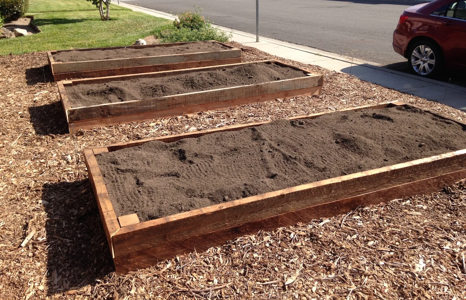 We filled the beds with 2 parts garden soil (purchased) and 1 part compost (free from city giveaway!). Now they look like giant litter boxes. Cool.