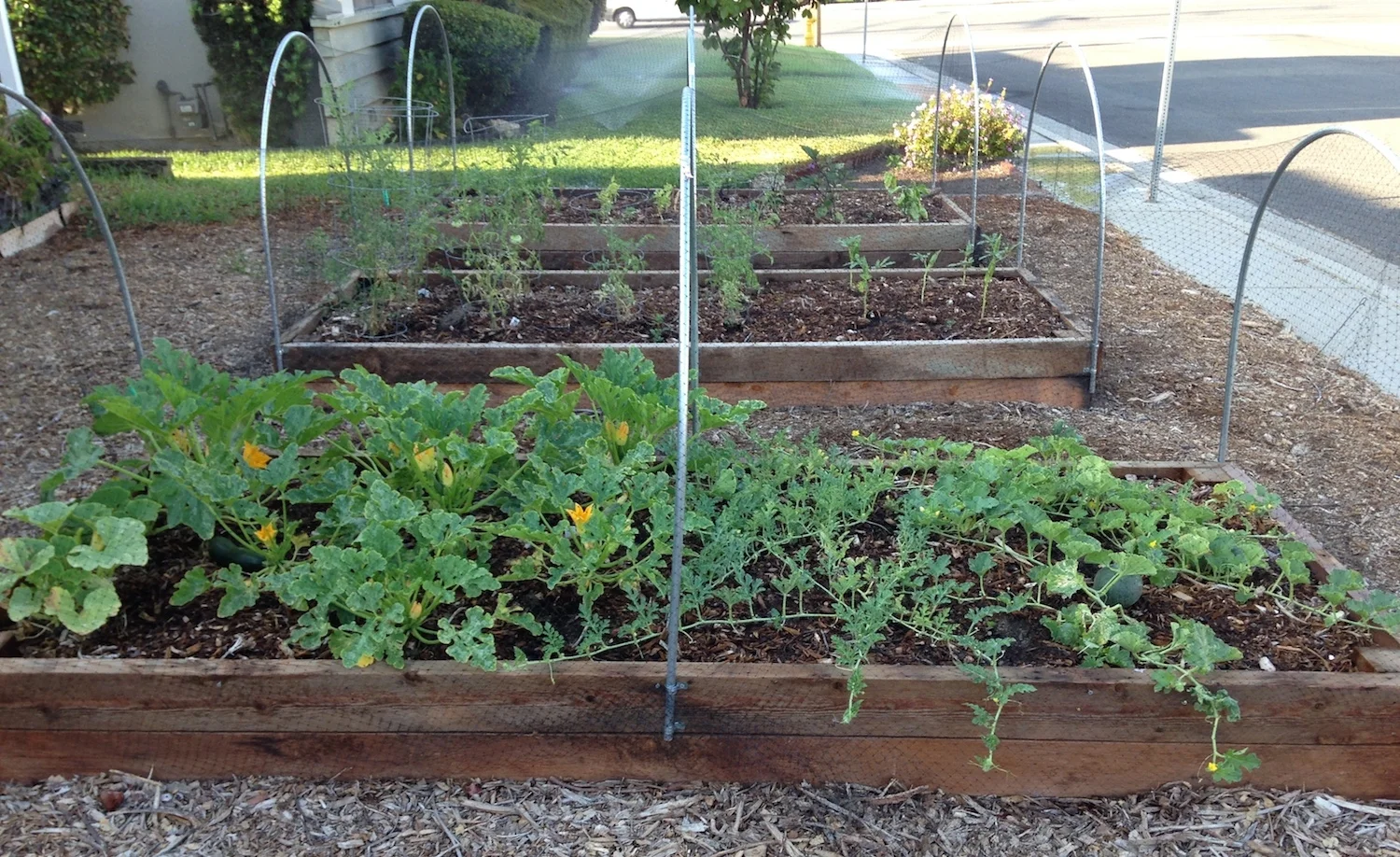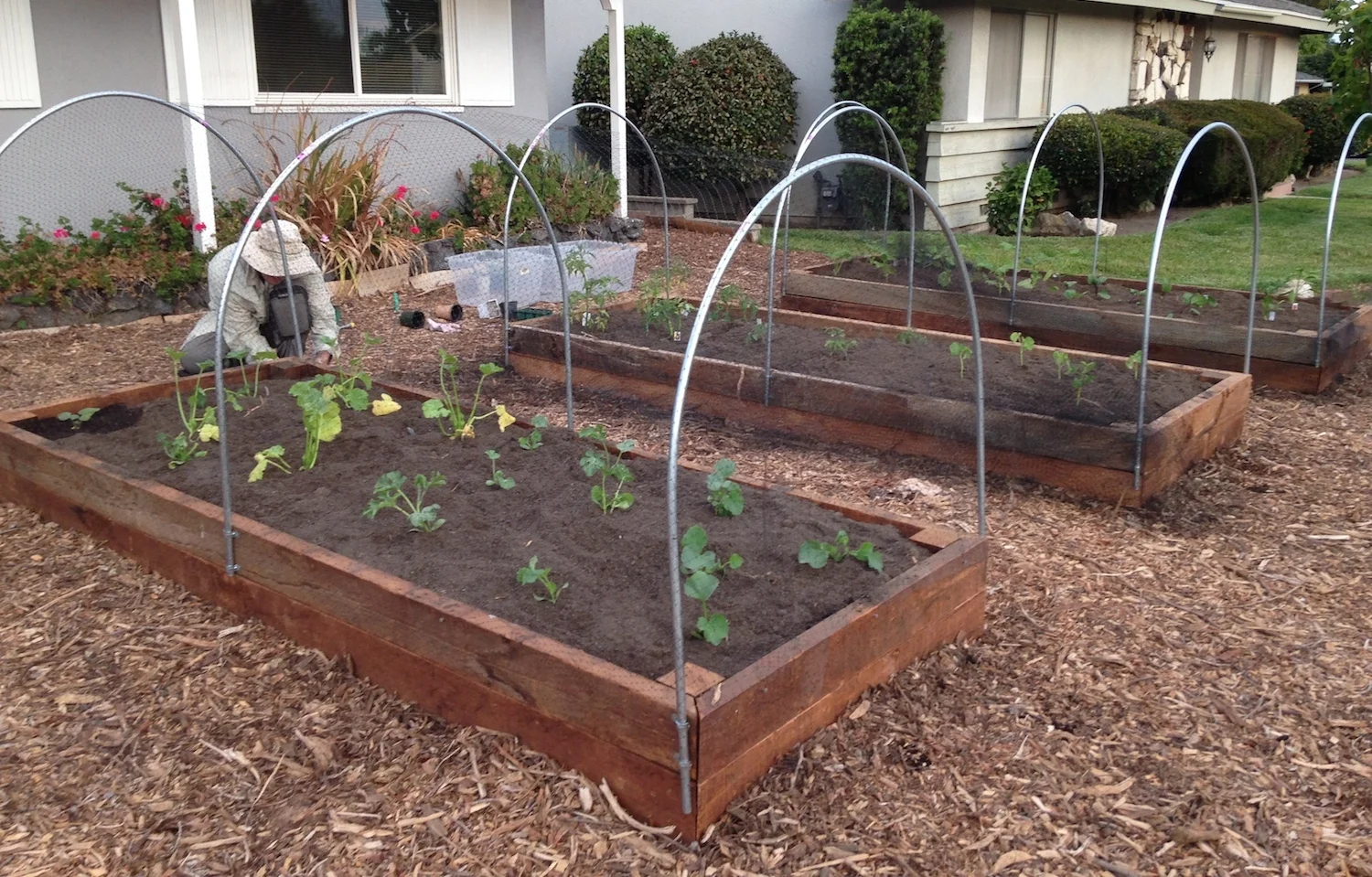 To keep out birds and pests (including neighborhood cats), Chris decided to cover the beds with hoops and netting.