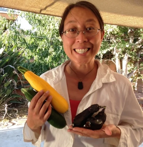 Here's me as a proud mama, holding a pair of squash in one hand and a pair of eggplant in the other. The fruits (veggies?) of our labor!