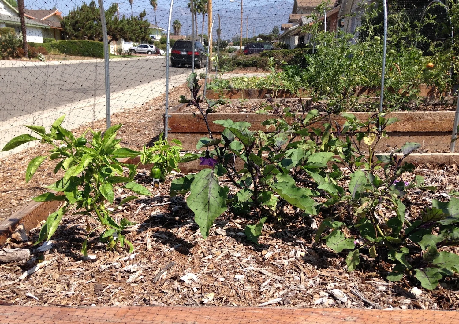 It's now been over 2 months since we first planted the starts, and I would say that overall they're doing... okay. I'd give our garden production a B-, maybe. The okra got infested by aphids, the green beans straight-up failed (scorched and chomped), and something is eating the crap out of the eggplant leaves. Pretty much everyone looks a little thin and grungy.