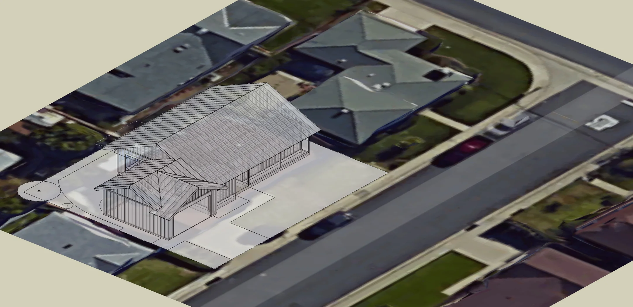 Axonometric view of the modeled house in context. Fun fact: The house is not actually transparent -- it's only a model!