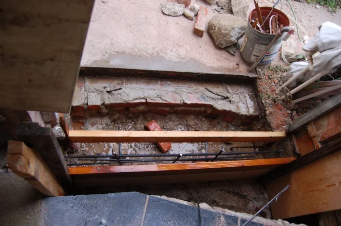 Now that I had finished the demolition grunt work, I hired two skilled contractors to help me form and pour the foundation wall. You only get one chance pouring concrete and I didn't want to screw it up. We cleaned out the pit with water and compressed air so that the new concrete could bind well to the old concrete and brick. We constructed wooden forms for the new foundation wall and installed rebar.